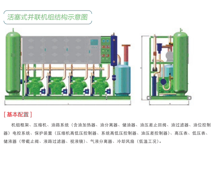基本配置: 機組框架、壓縮機、油路(lù)系統(含油加熱(rè)器(qì)、油分(fēn)離(lí)器(qì)、儲油器(qì)、油壓差止回閥、油過濾器(qì)、油位控制(zhì) 器(qì))電控系統、保護裝置(壓縮機高(gāo)低壓控制(zhì)器(qì)、系統高(gāo)低壓控制(zhì)器(qì)、油壓差控制(zhì)器(qì))、高(gāo)壓表、低壓表、 儲液器(qì)(帶截止閥、液路(lù)過濾器(qì)、視液鏡)、氣液分(fēn)離(lí)器(qì)、冷(lěng)卻風扇(低溫工(gōng)況)。